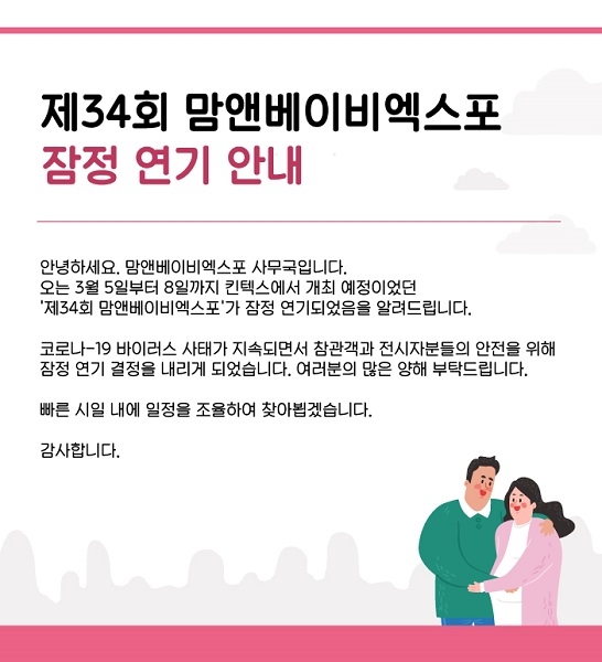 주최사인 ㈜유아림은 지난 27일 공식 홈페이지에 “3월 5일부터 8일까지 킨텍스에서 개최 예정이었던 ‘제34회 맘앤베이비엑스포’를 잠정 연기한다”라고 공지했다.