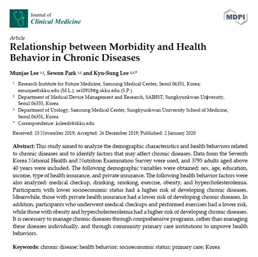 이규성(삼성서울병원 비뇨의학과) 삼성서울병원 스마트헬스케어 연구소장은 성균관대학교 삼성융합의과학원 의료기기산업학과 이문재 교수팀과 2017년 국민건강영양조사 자료를 이용해 만성질환을 진단받은 40대 이상 환자 3795명을 대상으로 분석한 연구결과를 지난 1월 2일 공개했다고 4일 밝혔다. 사진=Journal of Clinical Medicine 캡처이미지 확대보기