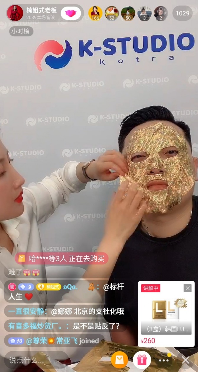지난달 29일 중국 베이징 K스튜디오에서 열린 왕홍 생방송에서 현지 인플루언서가 국내 중소·중견기업의 우수 소비재 품목을 홍보하고 있다. 사진=KOTRA