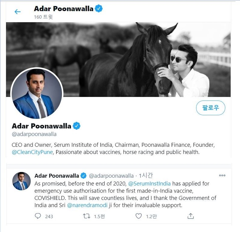 세계 최대의 백신 회사인 인도 세룸 인스티튜트(Serum Institute of India)의 아다르 푸나왈라(Adar Poonawalla) 최고경영자(CEO)가 7일(현지시간) 트위터에 이와 같은 글을 남겼다.