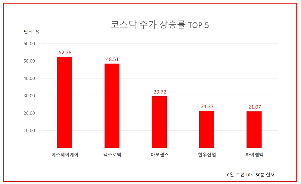 10일 오전 10시 50분 현재 코스닥 상승률 상위 50개 종목은 다음과 같다.
