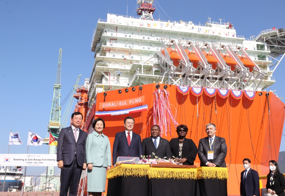문재인 대통령은 15일 필리프 자신투 뉴지 모잠비크 대통령 내외와 함께 경남 거제 삼성중공업에서 열린 부유식(Floating) 액화천연가스설비(LNG) 출항 명명식에 참석했다. 모잠비크 대통령 부부는 국가 정상으로는 8년 만에, 코로나19 이후 아프리카 정상으로는 처음으로 이번 행사를 위해 방한했다.