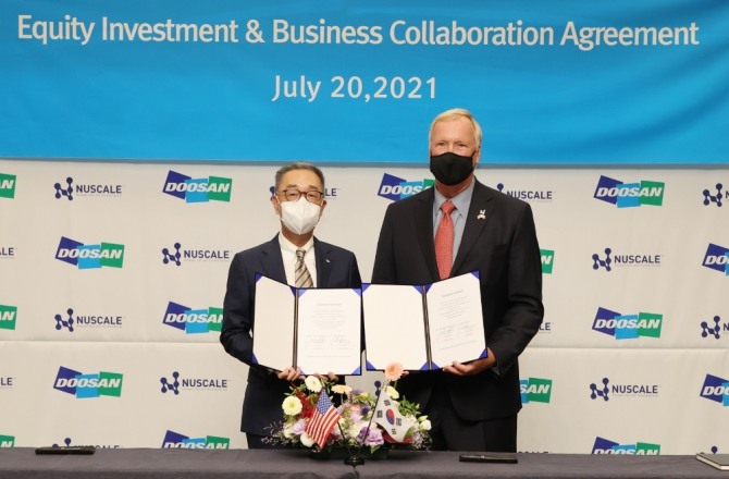 두산중공업은 지난 2019년 국내 투자사들과 함께 뉴스케일파워에 4400만 달러(521억원)의 지분 투자를 한 데 이어 지난 7월 추가로 6천만 달러(710억원)를 투자하면서 SMR를 활용한 수소·담수 생산 분야까지 양사의 협력을 넓혀가기로 했다.