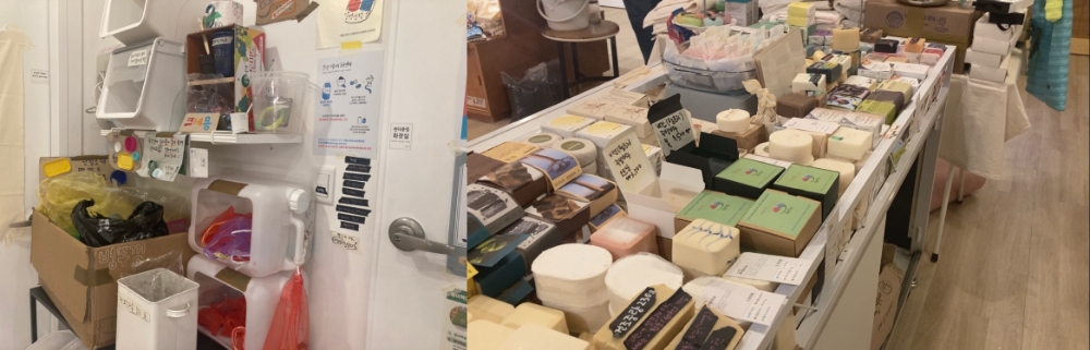 매장에서는 친환경 물품도 판매하고 있었다. 용기에 담기지 않은 샴푸바, 트리트먼트바 등 천연 비누제품부터 천연 수세미, 대나무 칫솔, 고체 치약, 나무 수저 등 생활용품들이 마련되어 있었다. 특히 천연 밀랍으로 만들어진 밀랍랩은 일회용 비닐랩을 대체할 수 있는 유용한 제품으로 눈에 띄었다.