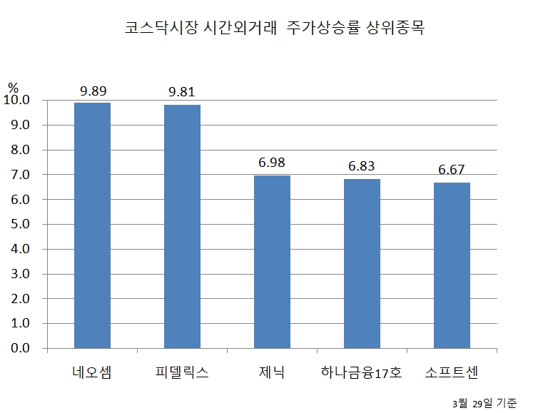 표기 순서는 상승률 순위, 종목명, 29일 시간외 종가, 시간외거래 주가 상승률 순이다.