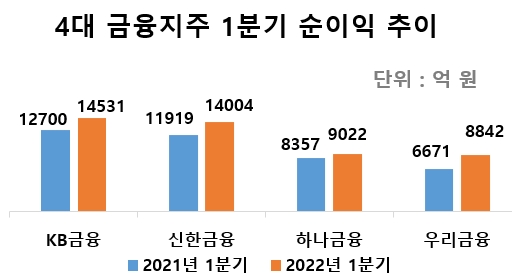 이미지 확대보기22일 금융권에 따르면 KB·신한·하나·우리 등 4대 금융그룹의 1분기 순이익이 4조6399억원으로 전년 동기 대비 17.03% 증가하며 1분기 기준 사상 최대치를 경신했다.