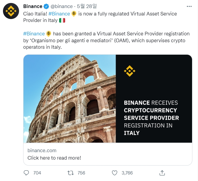 바이낸스는 또 28일 트위터 계정을 통해 "#Binance는 이제 이탈리아에서 완전히 규제되는 가상 자산 서비스 프로바이더입니다"라고 알렸다.