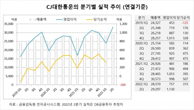 이미지 확대보기DB금융투자는 CJ대한통운의 올해 2분기 연결기준 매출액이 2조9297억원, 당기순이익이 1130억원으로 전망했습니다. CJ대한통운의 2분기 영업이익은 시장 컨센서스인 1091억원을 넘어설 것으로 보입니다.