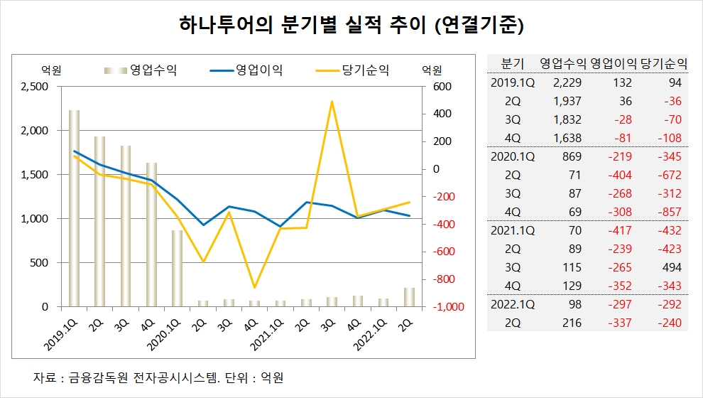 하나투어는 올해 2분기 실적을 집계한 결과 연결기준 영업수익(매출액)이 216억원, 영업이익이 –337억원, 당기순이익이 –240억원을 기록했다고 공시했습니다.