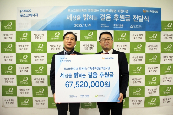 이전혁 포스코에너지 부사장은 “포스코에너지 임직원들의 자발적인 참여를 통해 마련된 기부금이 자립을 준비하며 사회에 첫 발걸음을 내딛는 청년들에게 도움이 되었으면 좋겠다”면서 “포스코에너지는 지속가능한 사회적 가치 창출을 위해 앞장서 나가겠다”고 전했다.