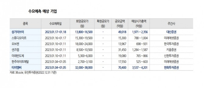 2023년 1월 수요예측 예상 기업. 자료=유진투자증권이미지 확대보기