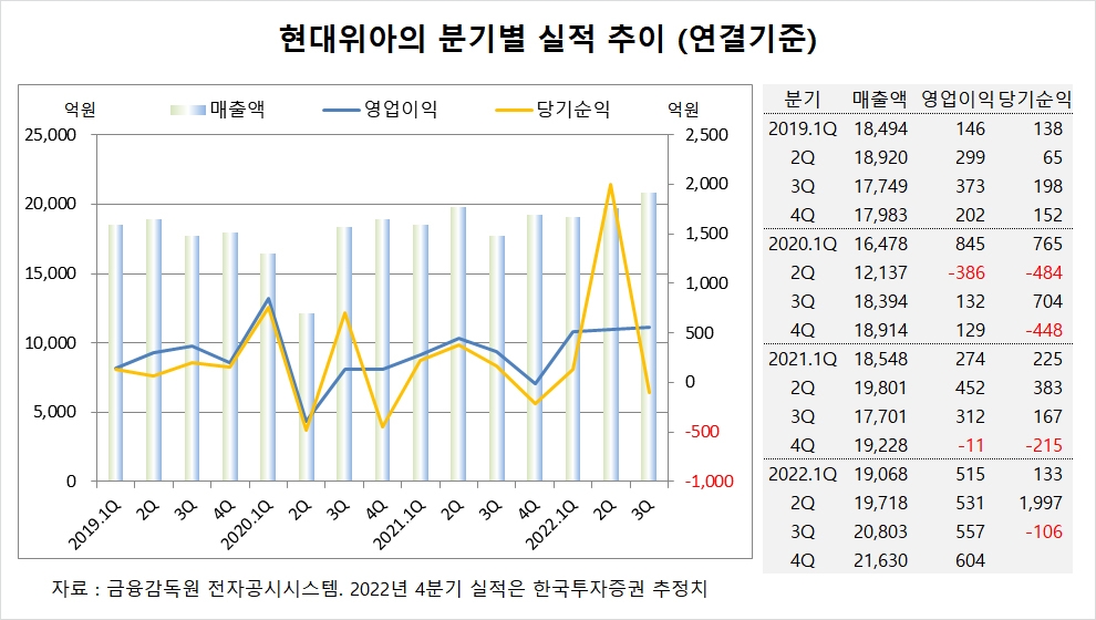 한국투자증권은 현대위아의 지난해 4분기 연결기준 매출액이 2조1630억원, 영업이익이 604억원에 이를 것으로 내다보고 있습니다. 현대위아의 작년 4분기 영업이익은 시장 컨센서스인 630억원을 밑돌 전망입니다.