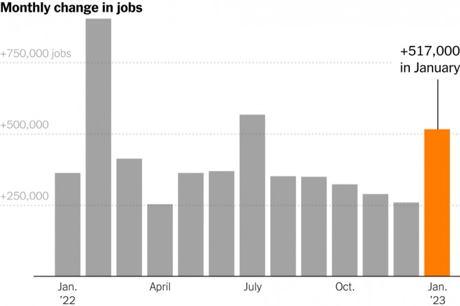 월가 이코노미스트들은 경기 침체 조짐으로 1월 실업률이 전달보다 소폭 오를 것으로 대체로 예상했는데 뚜껑을 열어보니 전달의 3.5%보다 더 낮아진 3.4%를 기록했기 때문이다. 그 결과 미국의 실업률은 1969년 5월 이후 무려 53년 만에 가장 낮은 수준을 보였다.