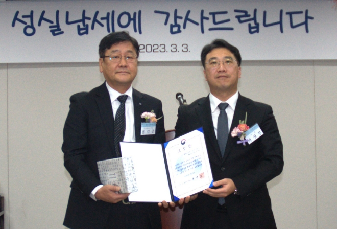 LIG넥스원이 지난 3일 중부지방국세청 기흥세무서에서 열린 ‘제57회 납세자의 날’ 기념식에서 기획재정부 장관 표창을 수상했다. 홍길준 LIG넥스원 경영관리본부장(왼쪽)이 박성무 기흥세무서장이 시상식 후 기념촬영을 하고 있다. 사진=LIG넥스원