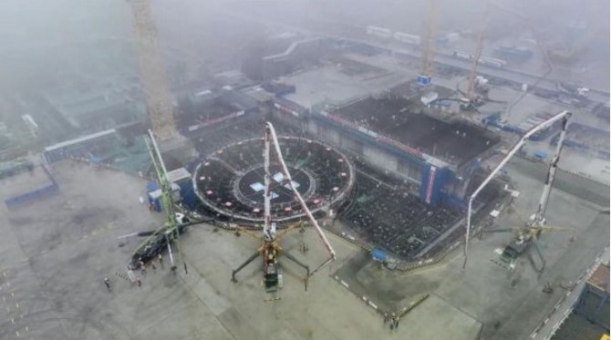 중국 싼먼 원자로 4호기의 첫 번째 콘크리트 타설 장면.
