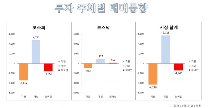 전날 기관은 4279억원 순매도를 기록했다. 유가증권시장에서 3417억원 팔아치웠으며 코스닥시장에서 862억원 팔아치웠다.