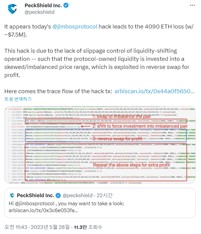 출시된 지 20일이 채 되지 않았지만 짐보스 프로토콜은 새로운 테스트 방식을 통해 유동성과 토큰 가격의 변동성을 해결하고자 했다. 그러나 프로토콜의 메커니즘이 적절하게 개발되지 않아 공격자에게 유리한 조건을 만드는 논리적 취약점이 발생했다. 그 결과, 기본 토큰인 짐보(JIMBO)의 가격이 40%나 급락했다.