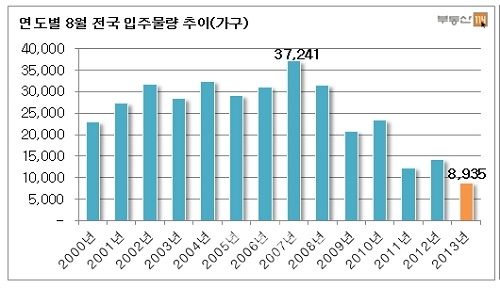 부동산114에 따르면 8월 전국 아파트 입주물량는 총 8935가구로 최근 10년 간 8월 물량 중 가장 적은 것으로 나타났다.