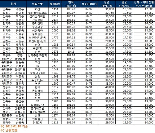 또한 금천구 시흥동 벽산타운1단지 84.99㎡의 평균 매매가 2억8000만원, 평균 전세가 1억7750만원으로 차이는 1억250만원으로, 벽산타운5단지 84.97㎡의 평균 매매가와 평균 전세가의 차이도 1억500만원으로 각각 조사됐다.