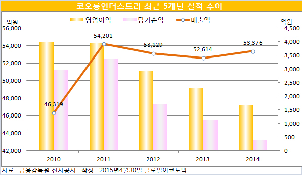 코오롱인더스트리의 최근 5년간 실적은 지난 2011년 매출액 5조4201억원을 정점으로 횡보국면을 보이고 있다. 지난해 매출액은 5조3376억원으로 전년의 5조2614억원보다 1.45% 늘었다.