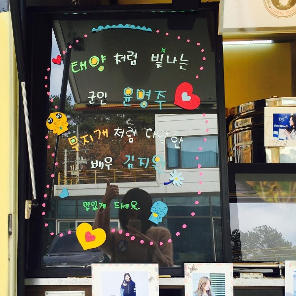 이미지 확대보기김지원은 20일 늦은 밤 자신의 인스타그램을 통해 “덕분에 힘내서 촬영할 수 있었어요! 너무 늦었지만 감사의 마음 전합니다.Thank you"라는 글과 함께 "태양처럼 빛나는 군인 윤명주. 무지개처럼 다양한 배우 김지원 맛있게 드세요"라는 손글씨가 유리창에 적혀 있고 군데군데 김지원의 사진으로 장식이 돼 있는 밥차나 간식차로 보이는 사진 한 장을 게재했다.