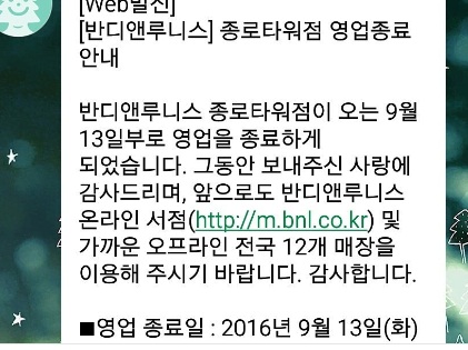 이미지 확대보기반디앤루니스는 24일 회원들에게 보낸 문자를 통해 반디앤루니스 종로타워점이 오는 9월13일부로 영업을 종료하게 됐다고 밝혔다.