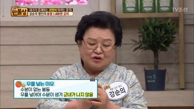이미지 확대보기19일 방송된 TV조선 '살림 9단의 만물상' 180회 '생활비 아끼는 꿀팁'으로 '1000원으로 김치 만들기' 편에서는 강순의 김치 명인이 출연, 봄철 김치 만드는 황금 레시피를 공개했다.