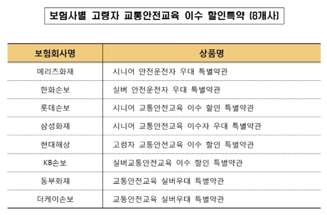 교통안전교육 이수 할인특약은 ▲도로교통공단의 교통안전교육 이수 ▲만65세 이상 운전자 ▲기명 피보험자 1인 또는 부부운전자 한정운전 특약을 조건으로 한 경우에 한해 자동차보험료를 연간 약 5% 할인 받을 수 있다.