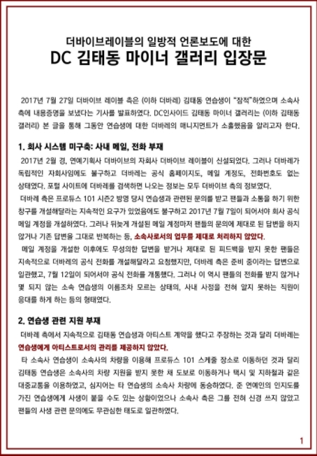 팬들은 “더 바이브 레이블 측의 일방적 언론보도를 믿지 않으며 김태동 연습생의 입장을 전적으로 지지한다”며 성명을 마쳤다.
