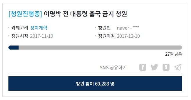 이미지 확대보기청와대 국민청원 및 제안 게시판에는 이명박 전 대통령의 출국금지 청원이 지난 10일부터 진행 중이다. 현재 6만9283명이 청원에 참여했다.