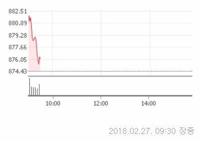 27일 오전 9시 30분 현재 코스닥은 전거래일대비 1.48포인트(0.17%)오른 875.89에 거래중이다.