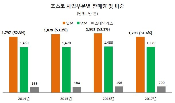 전체 판매에서 열연이 차지하는 비중은 절반 이상인 51.6%(1793만 톤)을 기록했다. 냉연은 1479만 톤으로 42.6%(1479만 톤), 스테인리스는 5.8%(200만 톤)이었다.