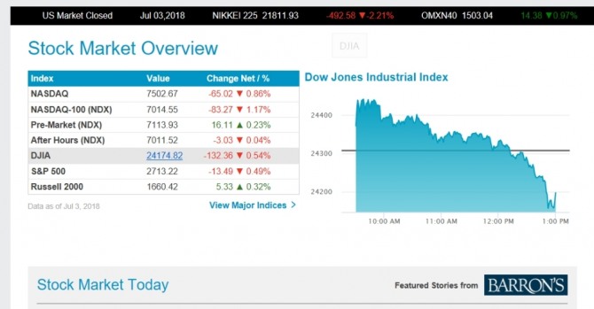 다우지수 즉 DJIA는 이날 2만4174.82로 마감했다. 다우지수는 전일 대비 132.36포인트 비율로는 ▼ 0.54% 떨어졌다 .( DJIA 24174.82 -132.36 ▼ 0.54%)