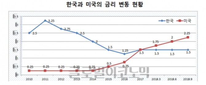 무엇보다 한미간 금리 역전현상이 심화되고 있다. 미국 연방준비제도(FED)가 지난 9월 금리를 2.00~2.25%까지 올리면서 국내 기준금리와 격차는 0.75% 포인트까지 벌어졌다.