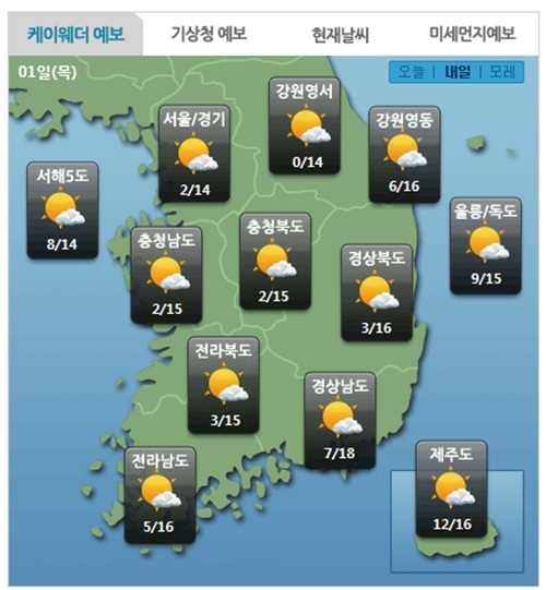 아침 최저기온은 0도에서 12도, 낮 최고기온은 14도에서 17도 분포가 예상된다.