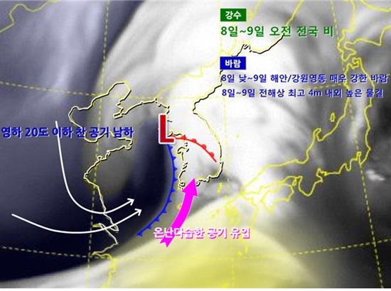 특히, 저기압 가장자리를 따라 남쪽으로부터 온난다습한 공기가 유입되면서, 8일 오후부터 밤 사이에 돌풍과 천둥·번개를 동반한 시간당 20mm 내외의 다소 강한 비가 내리는 곳이 있겠다.