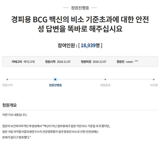 이어 그는 "어떻게 이제서야 검출이 된거며, BCG백신이 들어올 때 어떤 검사를 했는지, 어떤 성분들이 들어가 있는지, 또한 이런 사태를 대비해 앞으로의 관리방안과 이번 BCG백신 사건이 건강에 아무 이상이 없다면 꼭 해명하라"고 요구했다.