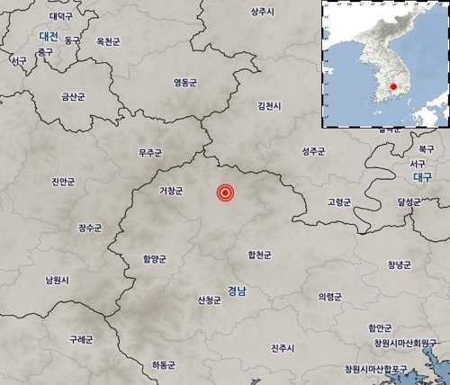 기상청은 거창군 북북동쪽 9km지역으로 북위 35.76, 동경 127.95에서 발생 깊이 12km의 지진이 발생했다고 밝혔다.