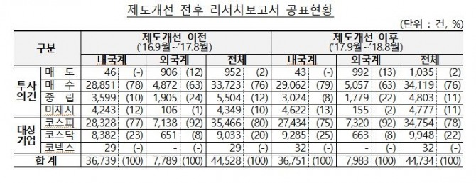 제도개선 이후 공표된 보고서 4만4734건 가운데 괴리율 공시 대상인 9488건(21.2%)에 대한 적정성 등을 점검한 결과, 9301건(98%)가 괴리율 산정 및 공시 등이 적정하게 이루어진 것으로 나타났다.