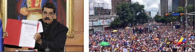5월 1일 제헌의회 추진계획을 서명한 마두로 대통령과 거리를 메운 시위대