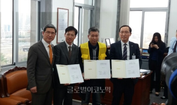 이미지 확대보기송전선로 건설 당사자들인 경기 안성시 원곡면 주민대책위원회와 한국전력공사, 삼성전자는 12일 오후 서울 여의도 국회에서 서안성~고덕 송전선로 건설 3자 상생협력 협약을 맺었다.