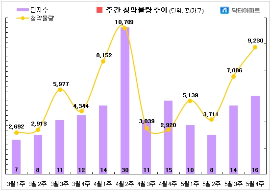 이미지 확대보기18일 부동산 리서치회사 닥터아파트 집계에 따르면, 5월 넷째 주 청약물량은 16곳 9230가구며 견본주택은 12곳 문을 열 예정이다. 당첨자 발표는 15곳, 당첨자 계약은 9곳이다
