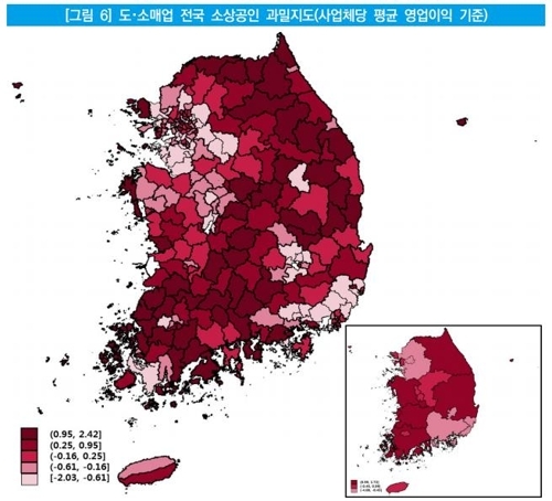 9일 중소기업연구원이 발표한 '전국 소상공인 과밀화 현황과 시사점'에 따르면, 도·소매업과 숙박·음식업종의 영업이익이 같은 업종의 근로자 평균임금보다 낮은 과밀화 상태인 지역이 전국 시군구 지역의 90% 이상인 것으로 나타났다.
