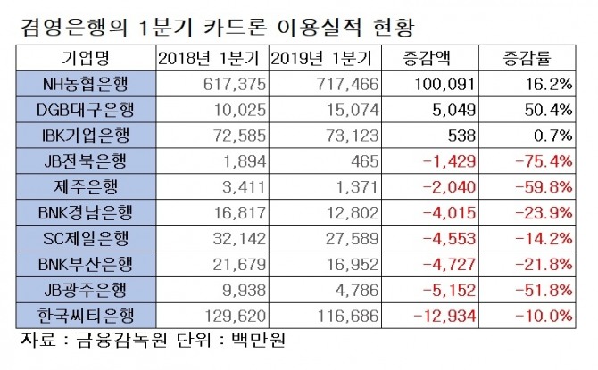 DGB금융지주의 대구은행의 1분기 카드론 이용 실적은 150억7400만원으로 같은 기간 50.4%나 증가했으나 증가액 규모만 보면 농협은행에 비해 덜하다. IBK기업은행, 씨티은행 등 다른 겸영은행들은 농협은행에 비해 기본적으로 카드론 이용 규모 자체가 적을 뿐 아니라 1분기 카드론 이용 실적이 크게 감소했다.