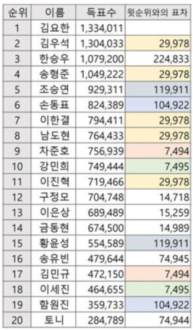이외에도 1위부터 10위까지 표 차이를 분석하면 '7천494'와 '7천595'라는 특정한 숫자의 배수로 모두 분석 가능하다는 주장이 제기됐다. 11위와 12위 표 수를 합친 숫자 2만9천977도 7천494와 9천595의 조합으로 설명할 수 있다는 게 팬들의 주장이다. 우연이라고 하기에는 숫자가 정확하게 맞아 떨어진다는 지적이다.