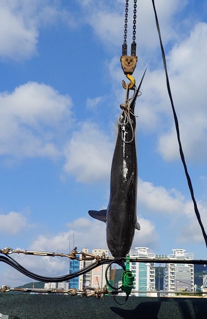 악상어(salmon shark)가 31일 부산 해운대 앞바다에서 잡혀 여름 휴가철을 맞아 바다를 찾은 이들을 긴장시키고 있다.