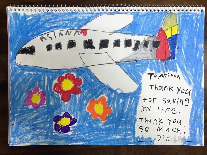 뒤늦게 승객 협조와 항공사 도움으로 딸 아이가 위험을 면하게 된 것을 알게된 최 양 아버지는 감사 인사와 함께 최양이 직접 그린 아시아나항공 비행기 그림을 편지로 보내왔다.