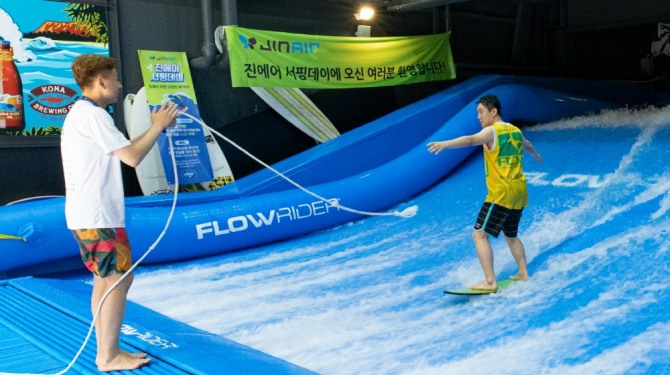 한편 진에어는 고객 대상으로도 올해 1월부터 서핑데이 행사를 매월 정기적으로 개최하고 있다. 진에어는 추첨을 통해 선정된 고객 20명에게 매월 10일 플로우하우스 실내 서핑장 무료 이용권과 전문 트레이너에 의한 서핑클래스를 제공하고 있다. 응모방법은 진에어 홈페이지 내 프로모션 메뉴에서 확인할 수 있다.