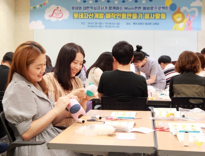 이번 봉사활동은 ‘롯데 mom편한 예비맘 프로젝트’의 일환으로 계획됐다. 롯데와 대한적십자사가 협업해 산모들에게 육아물품과 산모 교육을 지원하는 사회 공헌 사업이다. 임직원들이 만든 애착인형은 육아물품과 함께 전달된다.