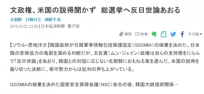 니케이(日本經濟)는 특히 서울 특파원인 온지 요스케 이름으로 "한국 정부가 한일 군사 정보 포괄 보호 협정 (GSOMIA)의 폐기를 결정했다. 한미일 안보 협력의 균열을 심화 판단이지만, 문재인 (문재인) 정권은 자신의 지지층을 노려보고 "반일 여론 '을 부추 겨 한국과의 대화에 응하지 않는 북한 비위를 맞추는 건 를 선택했다. 미국의 설득을 뿌리 치고 결단에 보수 세력으로부터 비판의 목소리도 나오고 있다"고 보도했다. .